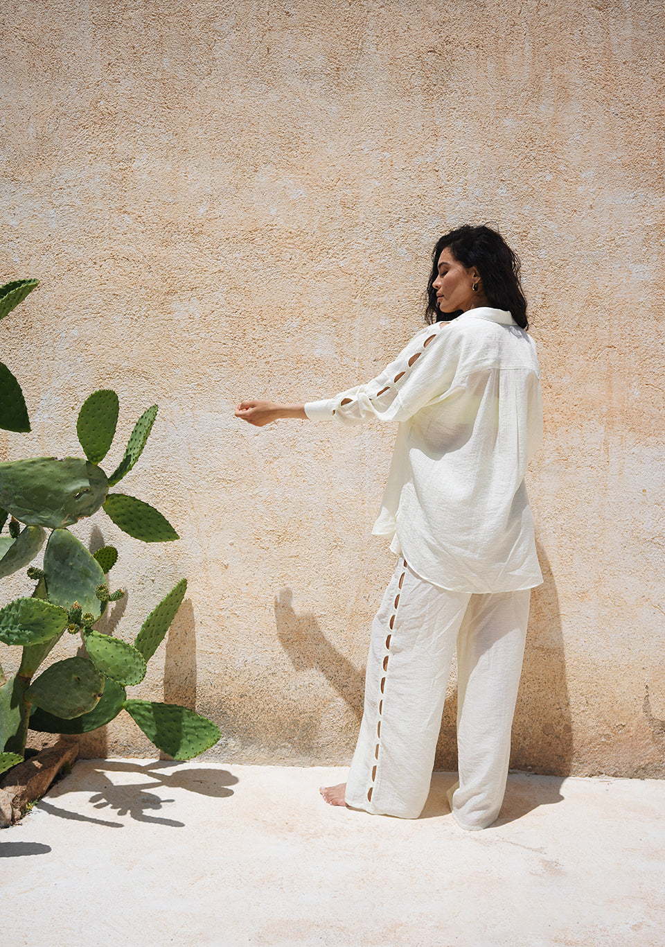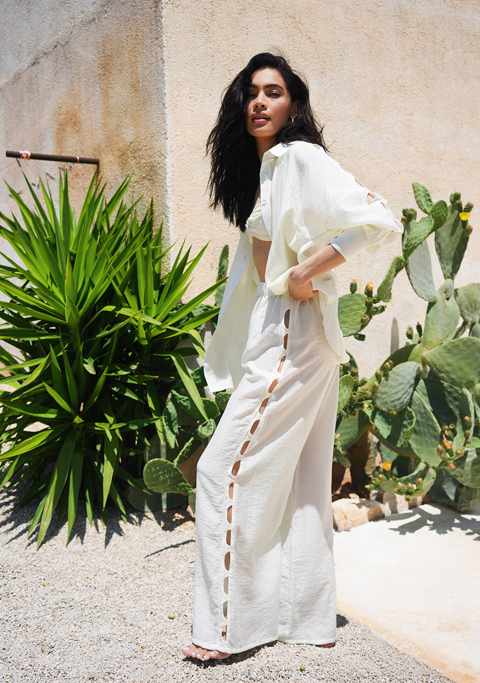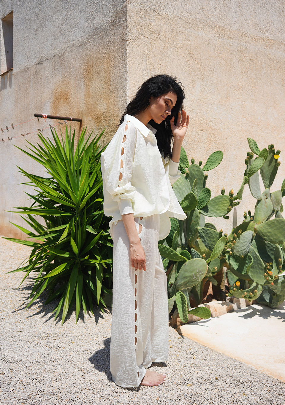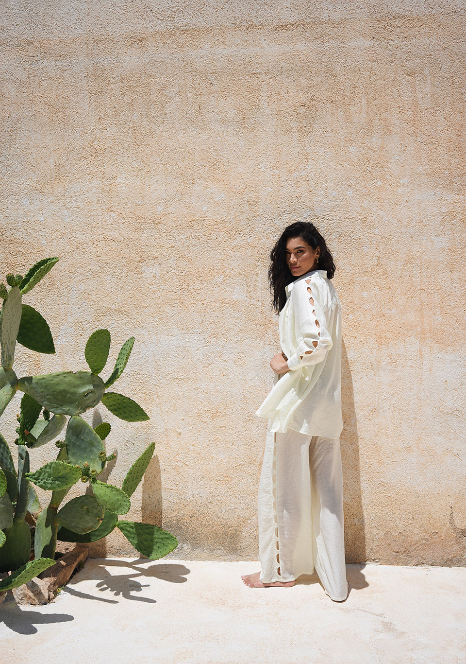 Un traje decorado con un diseño inusual que, debido a su corte suelto, te dará una sensación de libertad y comodidad. El top, los pantalones y la camisa se pueden combinar entre sí, creando muchos looks de viaje.