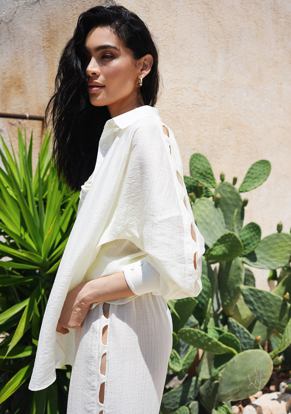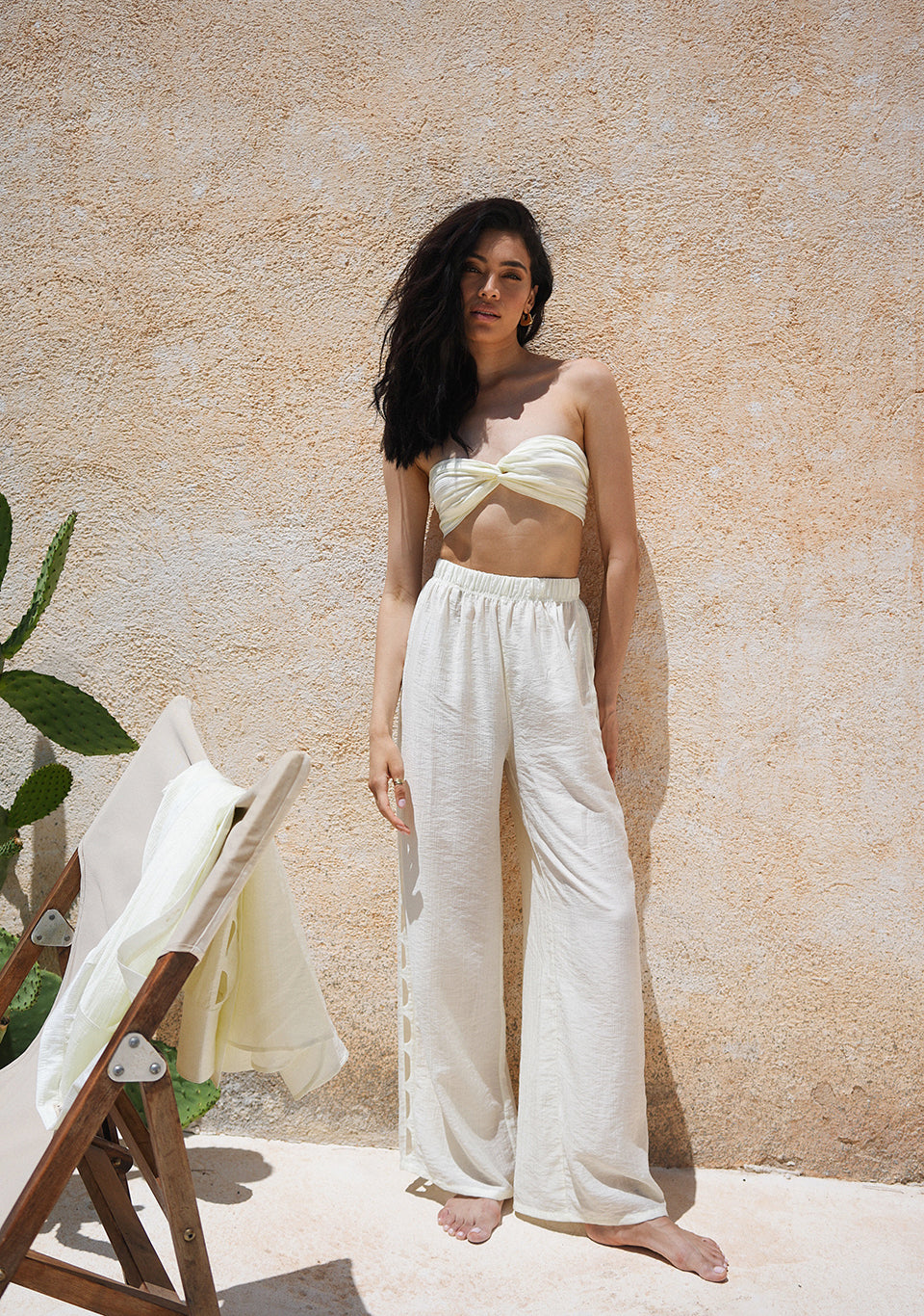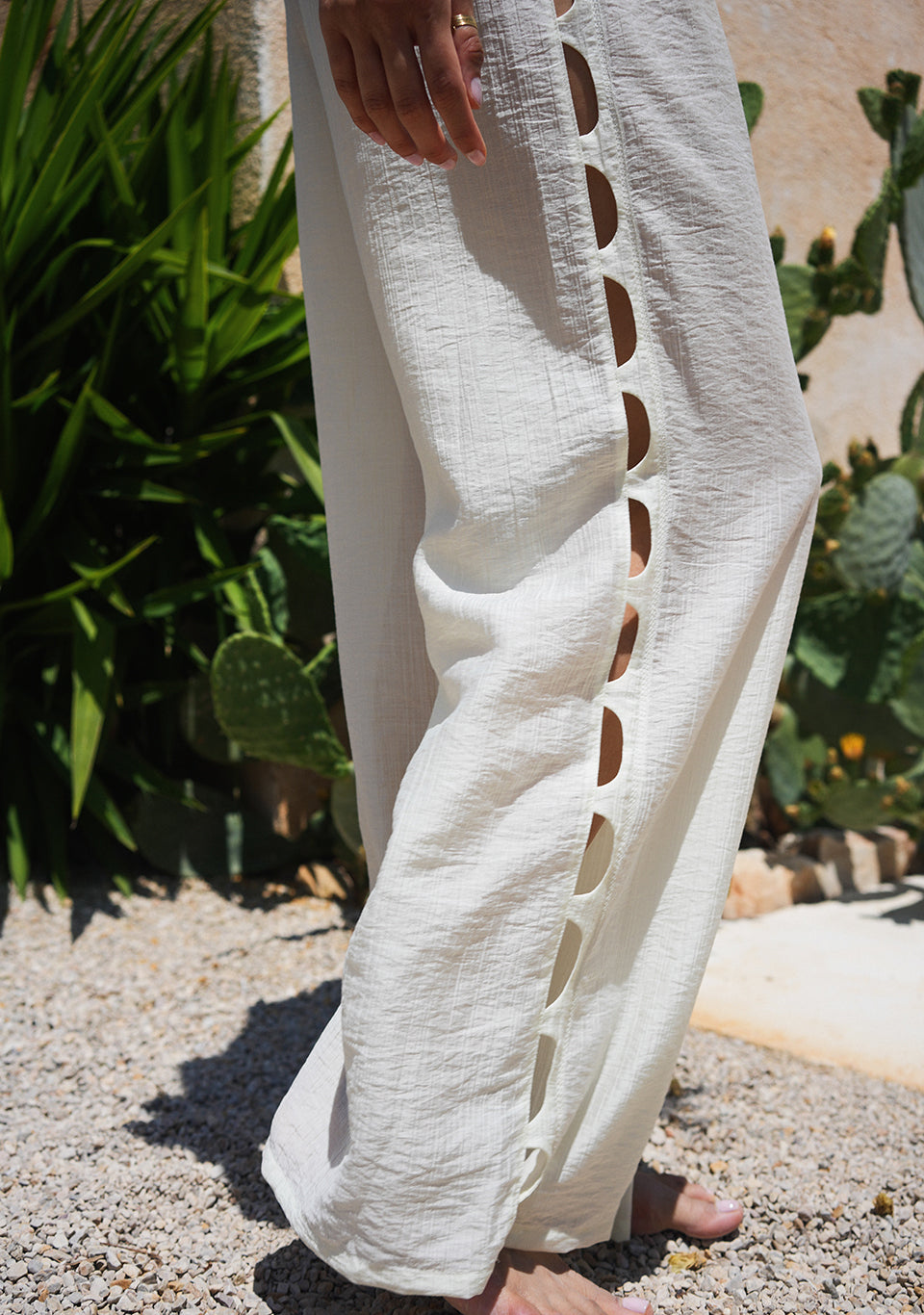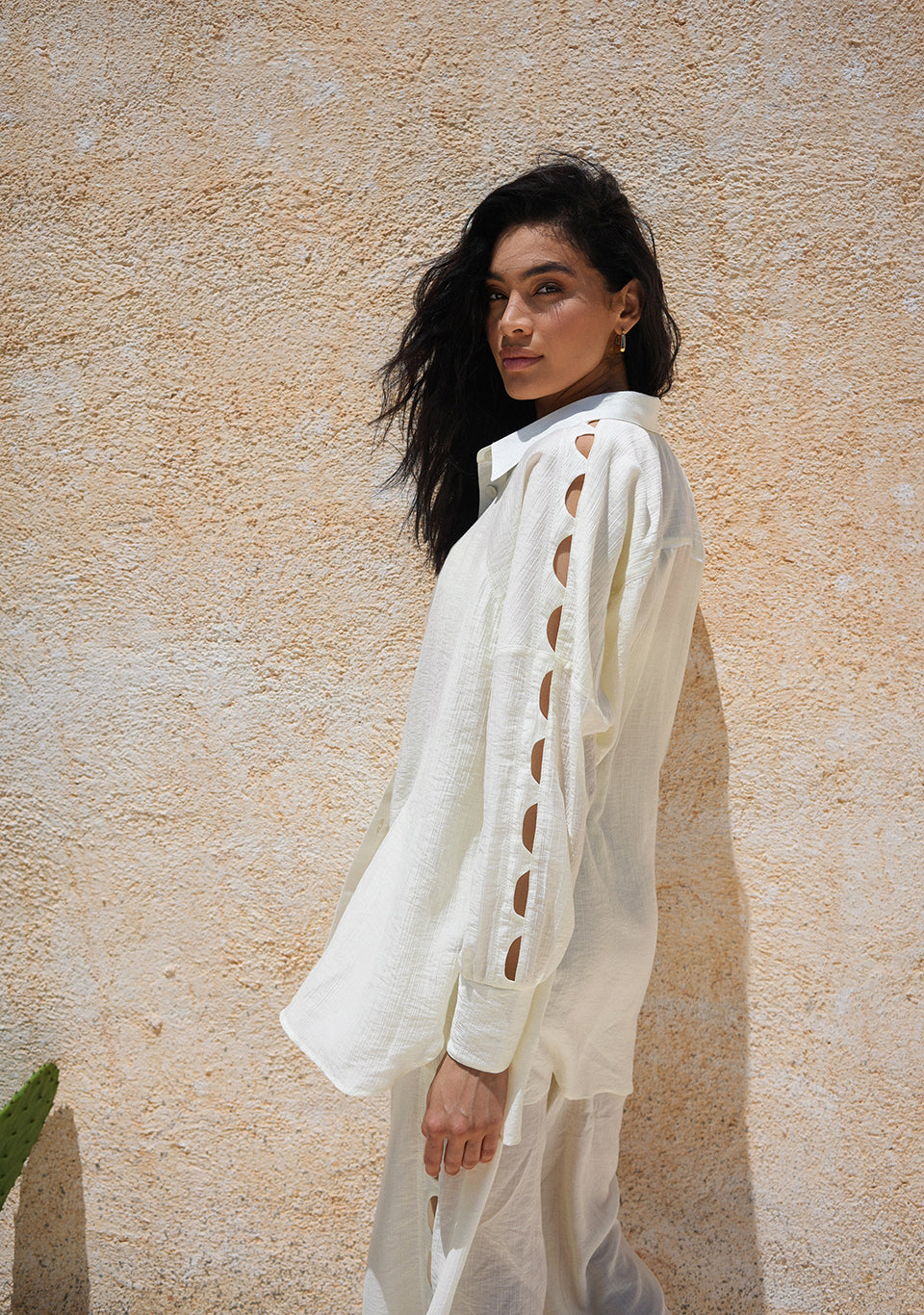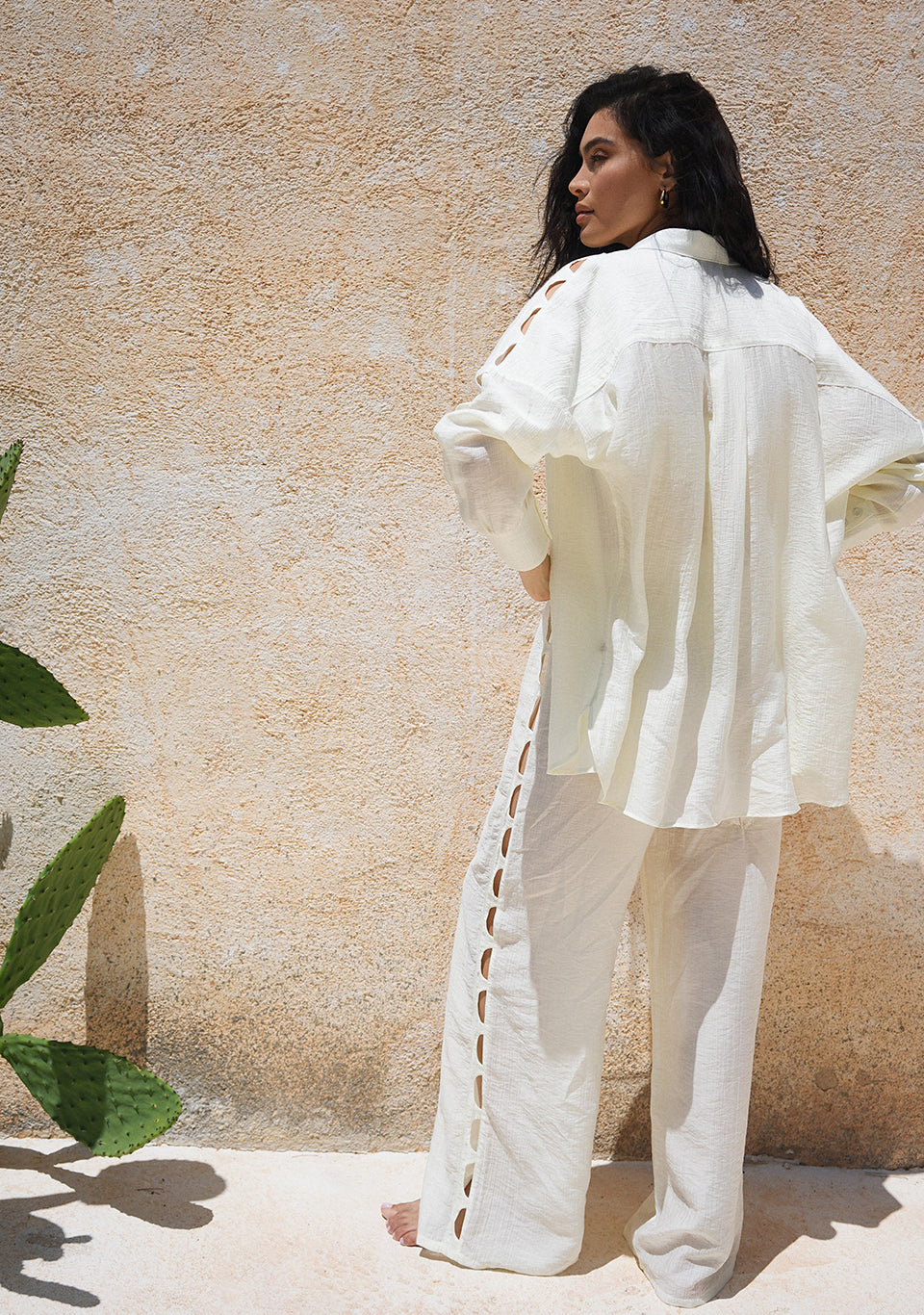 Un traje decorado con un diseño inusual que, debido a su corte suelto, te dará una sensación de libertad y comodidad. El top, los pantalones y la camisa se pueden combinar entre sí, creando muchos looks de viaje.