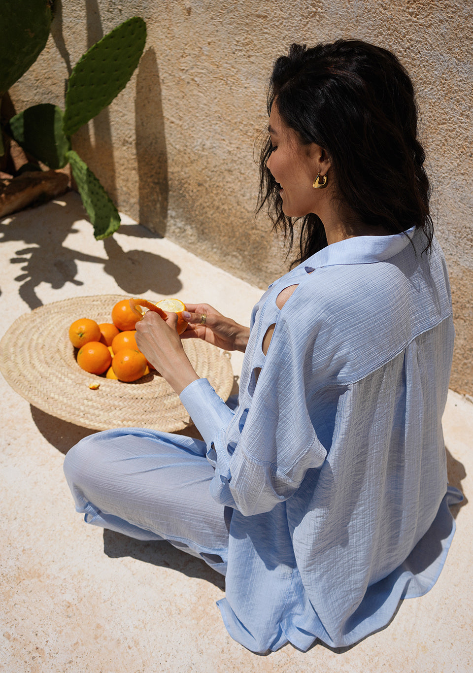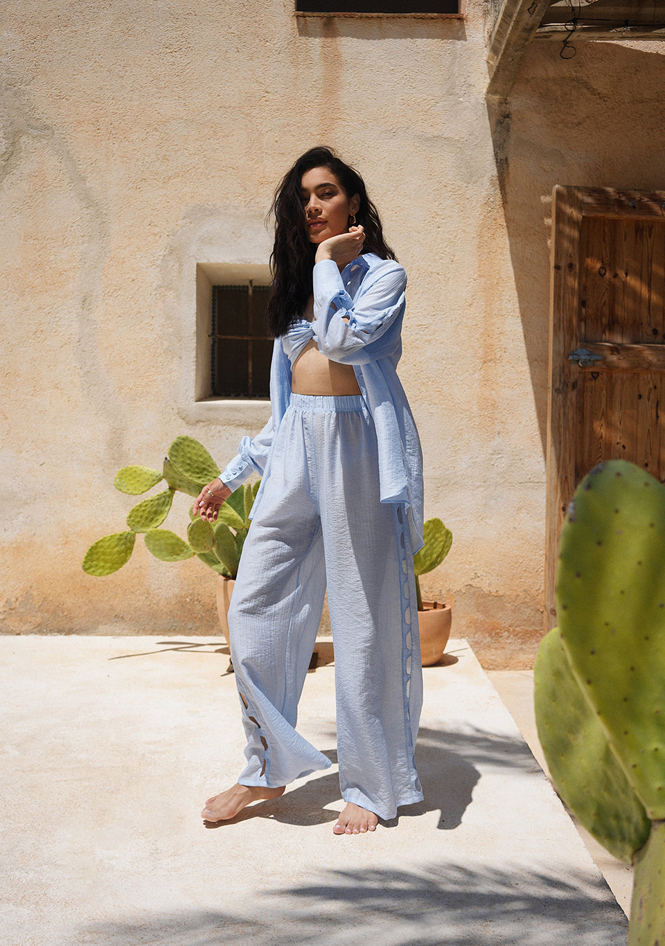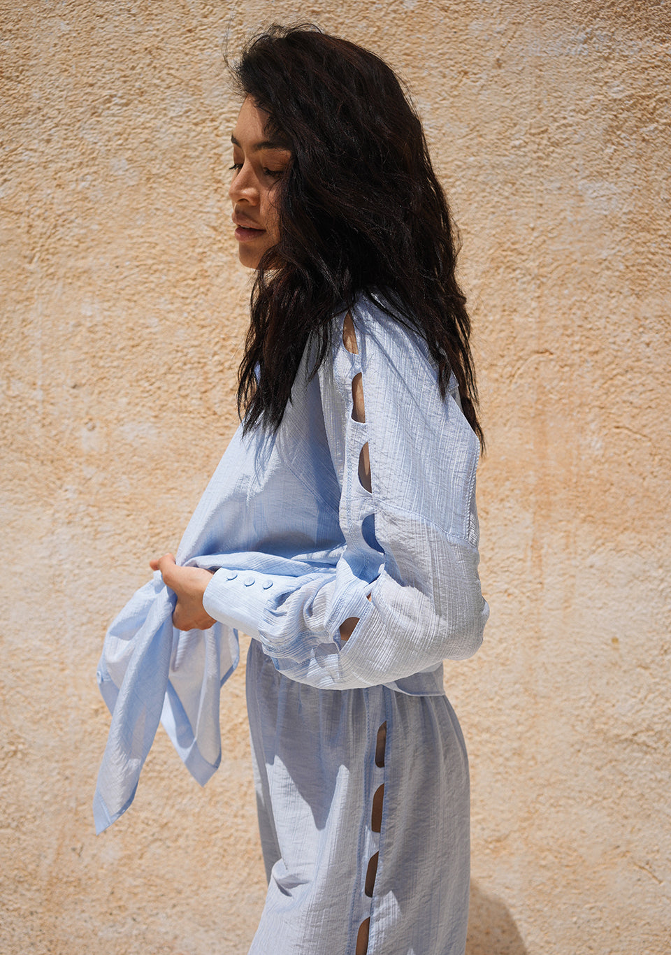 Un traje decorado con un diseño inusual que, debido a su corte holgado, te dará una sensación de libertad y comodidad. El top, los pantalones y la camisa se pueden combinar entre sí, creando muchos looks de viaje.