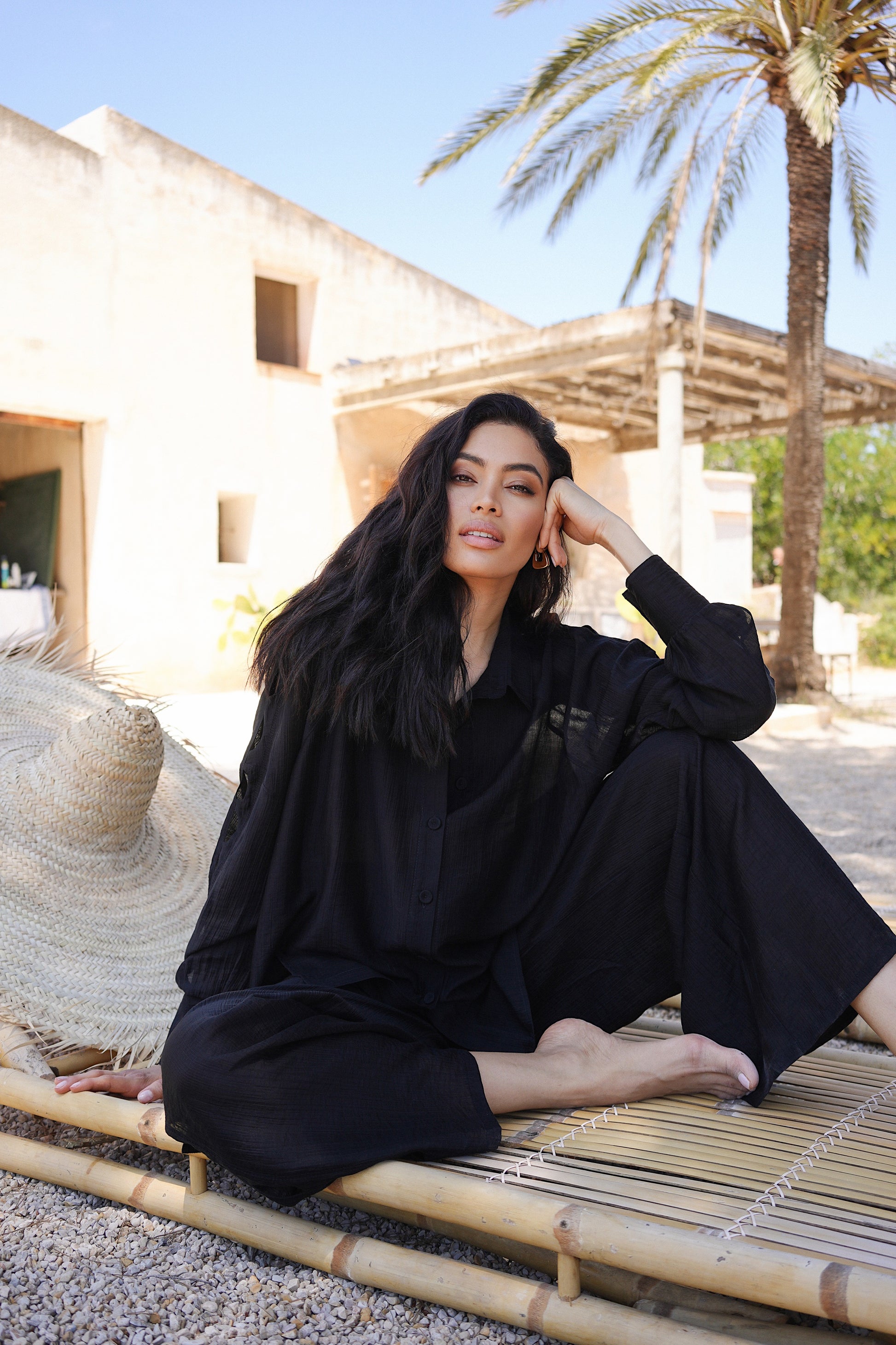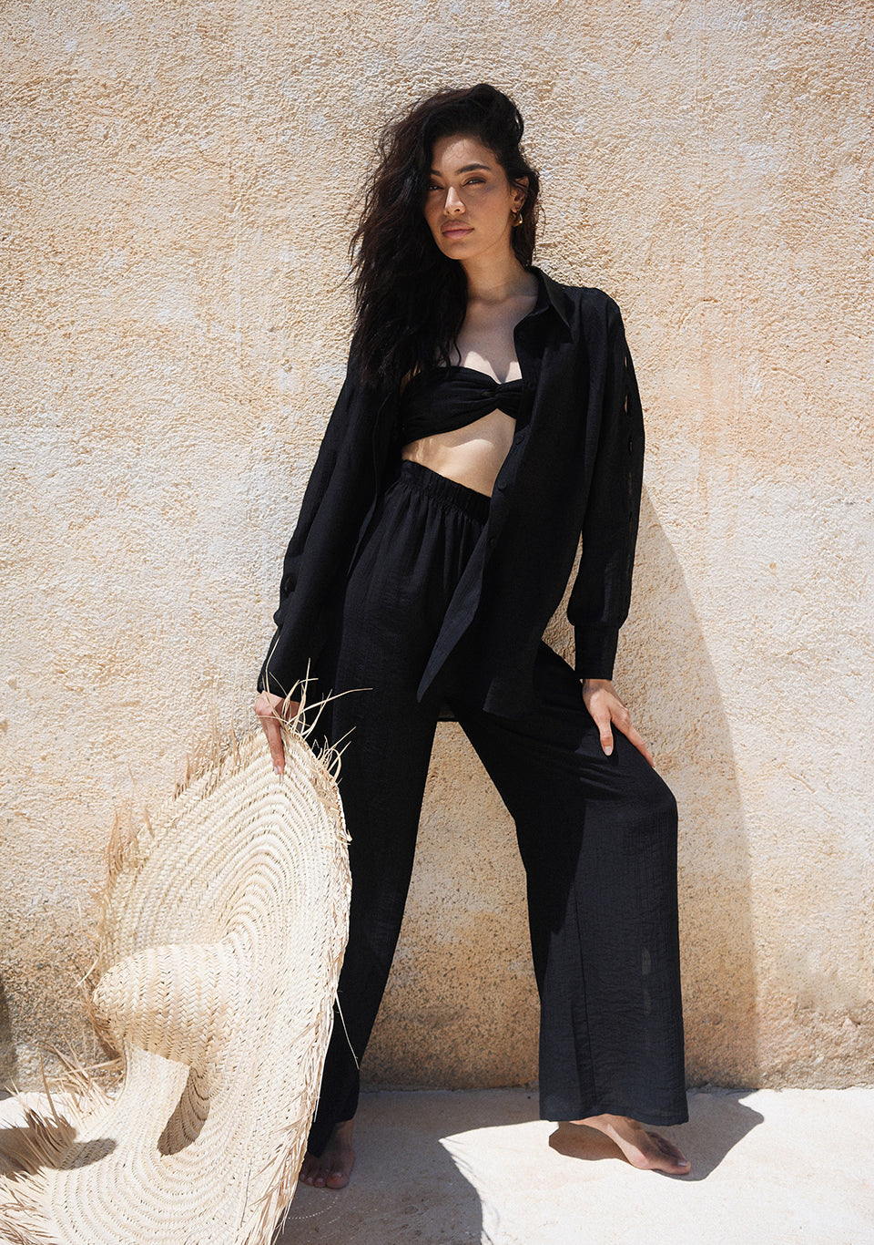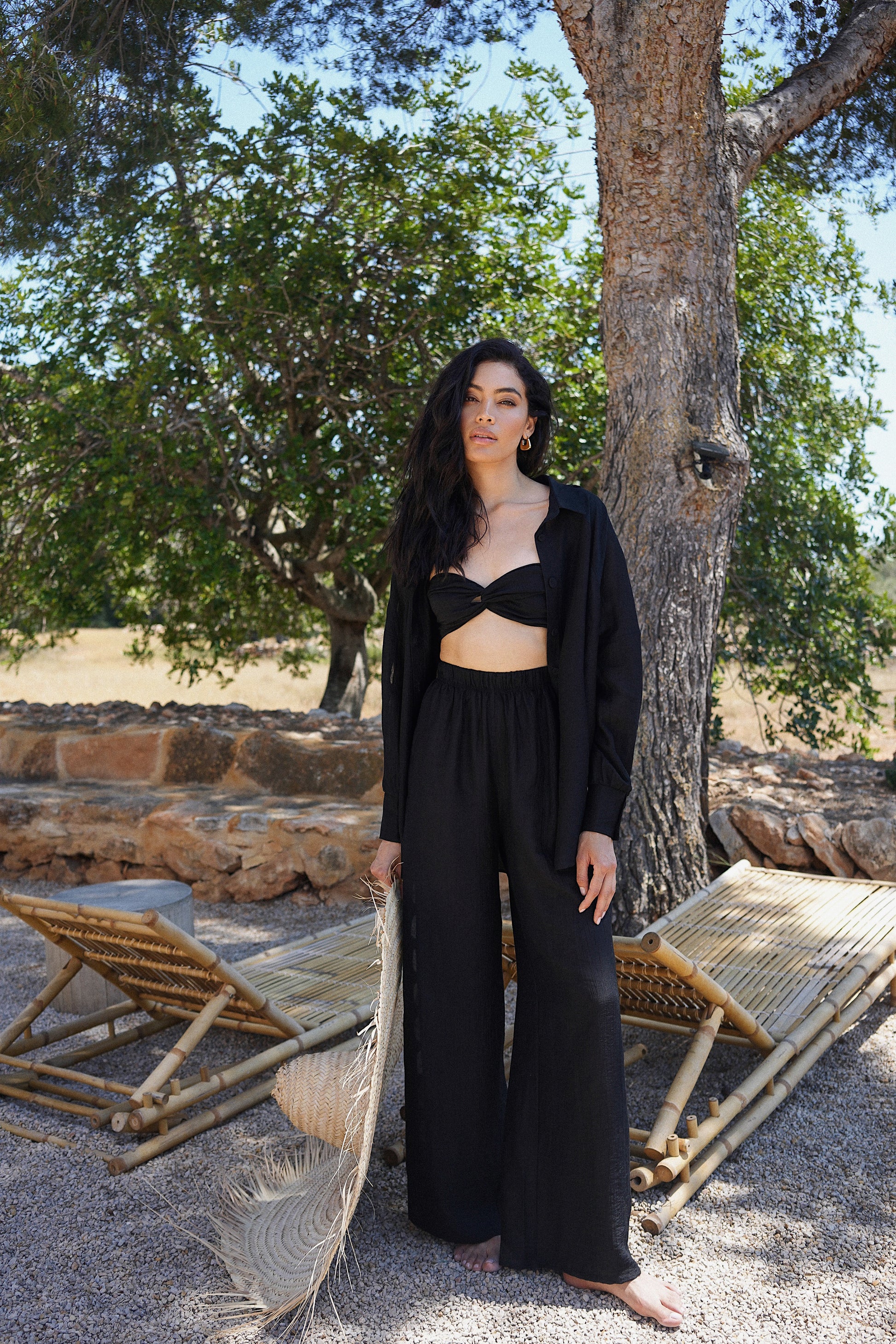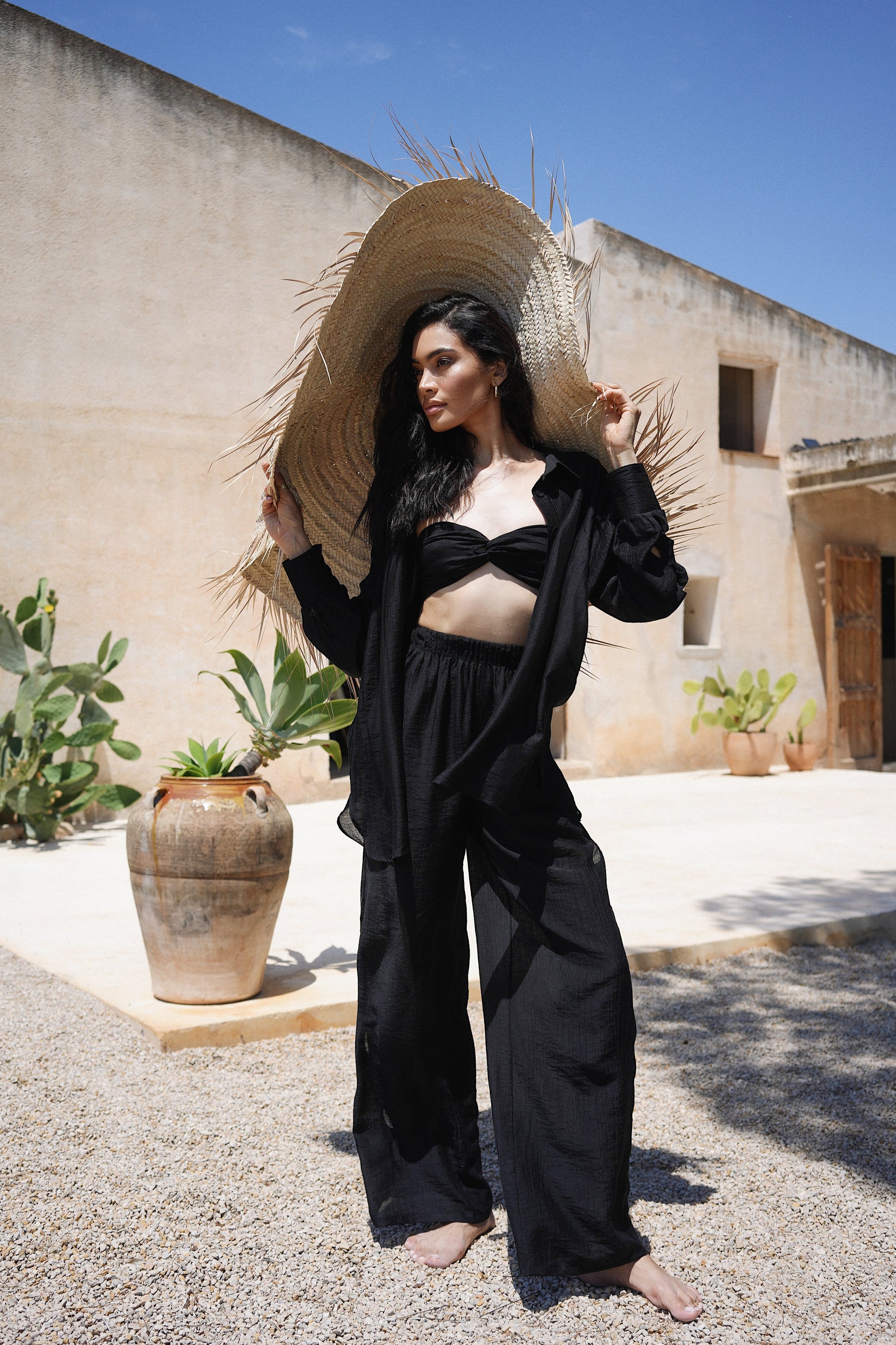 Un traje decorado con un diseño inusual y, debido a su corte suelto, te dará una sensación de libertad y comodidad. El top, los pantalones y la camisa se pueden combinar entre sí, creando muchos looks de viaje.