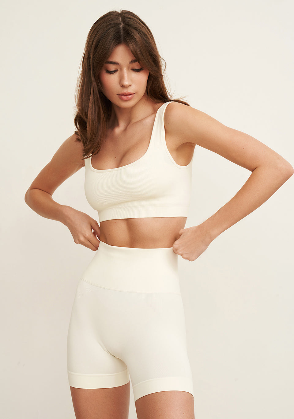 The basic tank top and shorts. This set is suitable for both active fitness classes and as comfortable home wear. The close-fitting silhouette, classic  scoop neckline and comfortable wide straps make this garment essential and versatile.