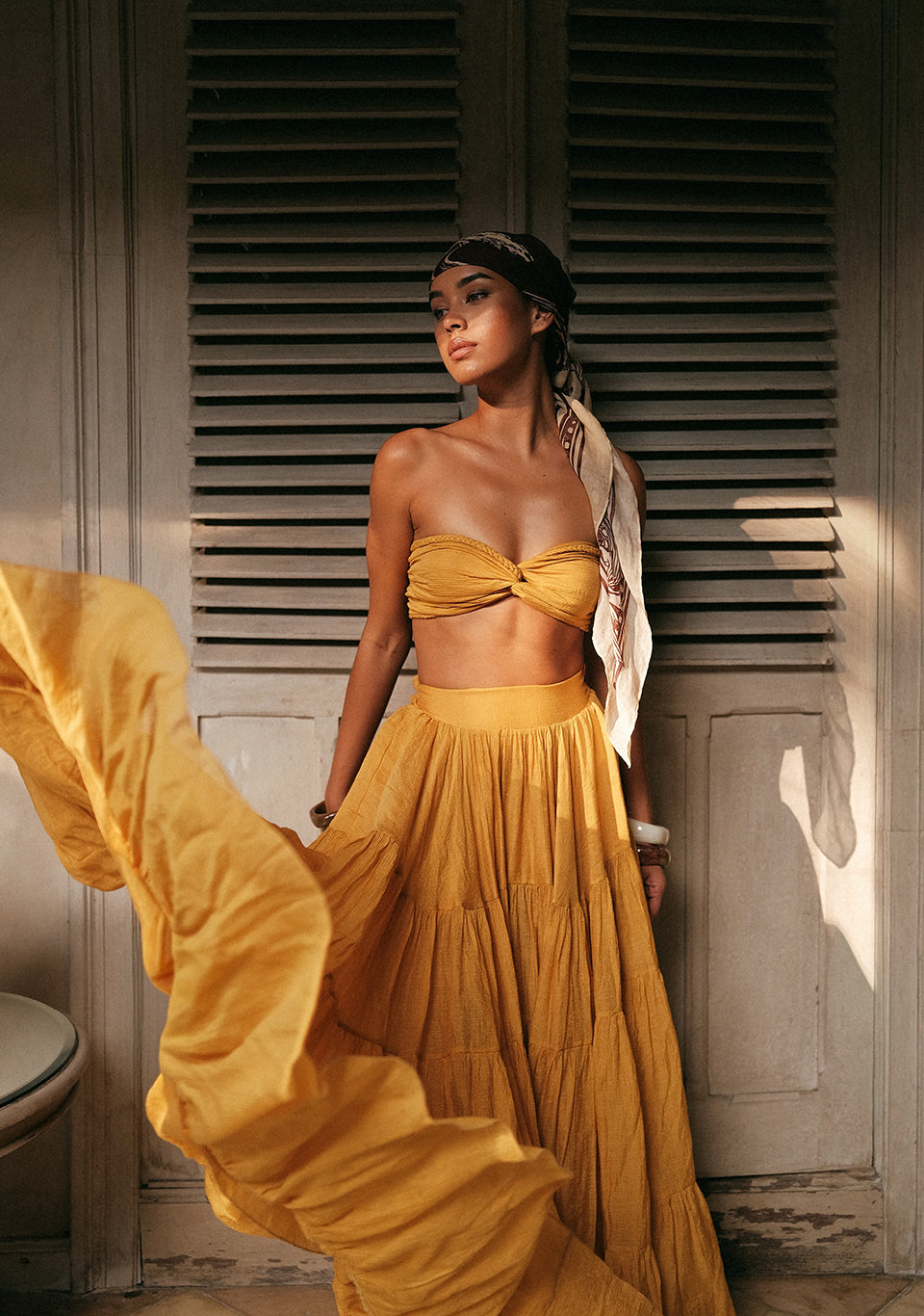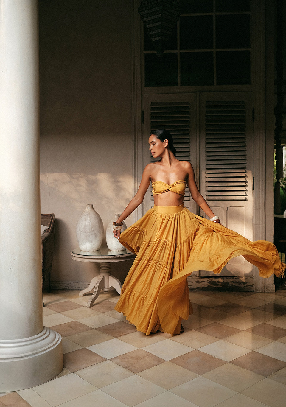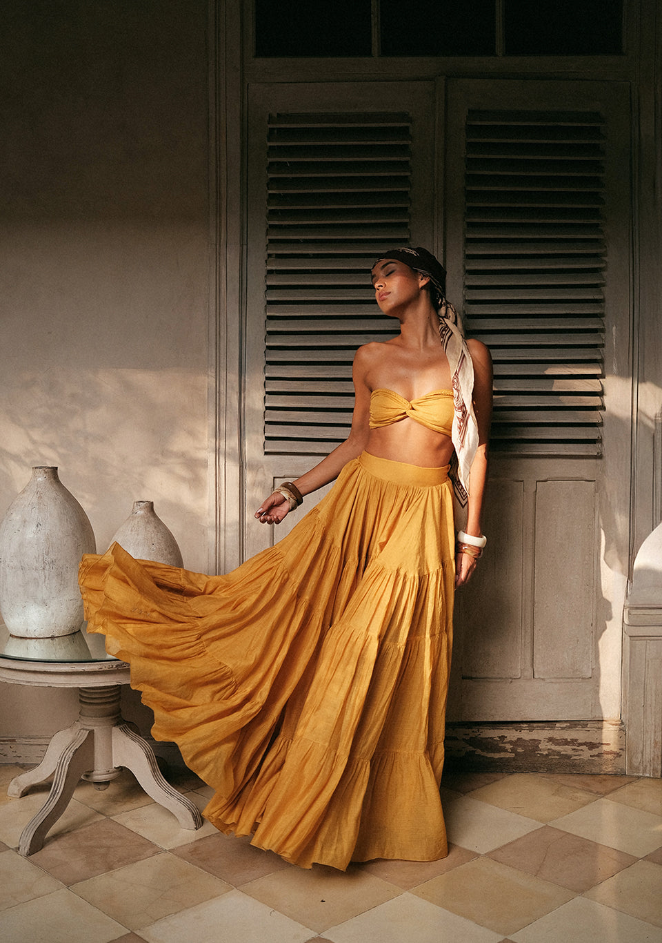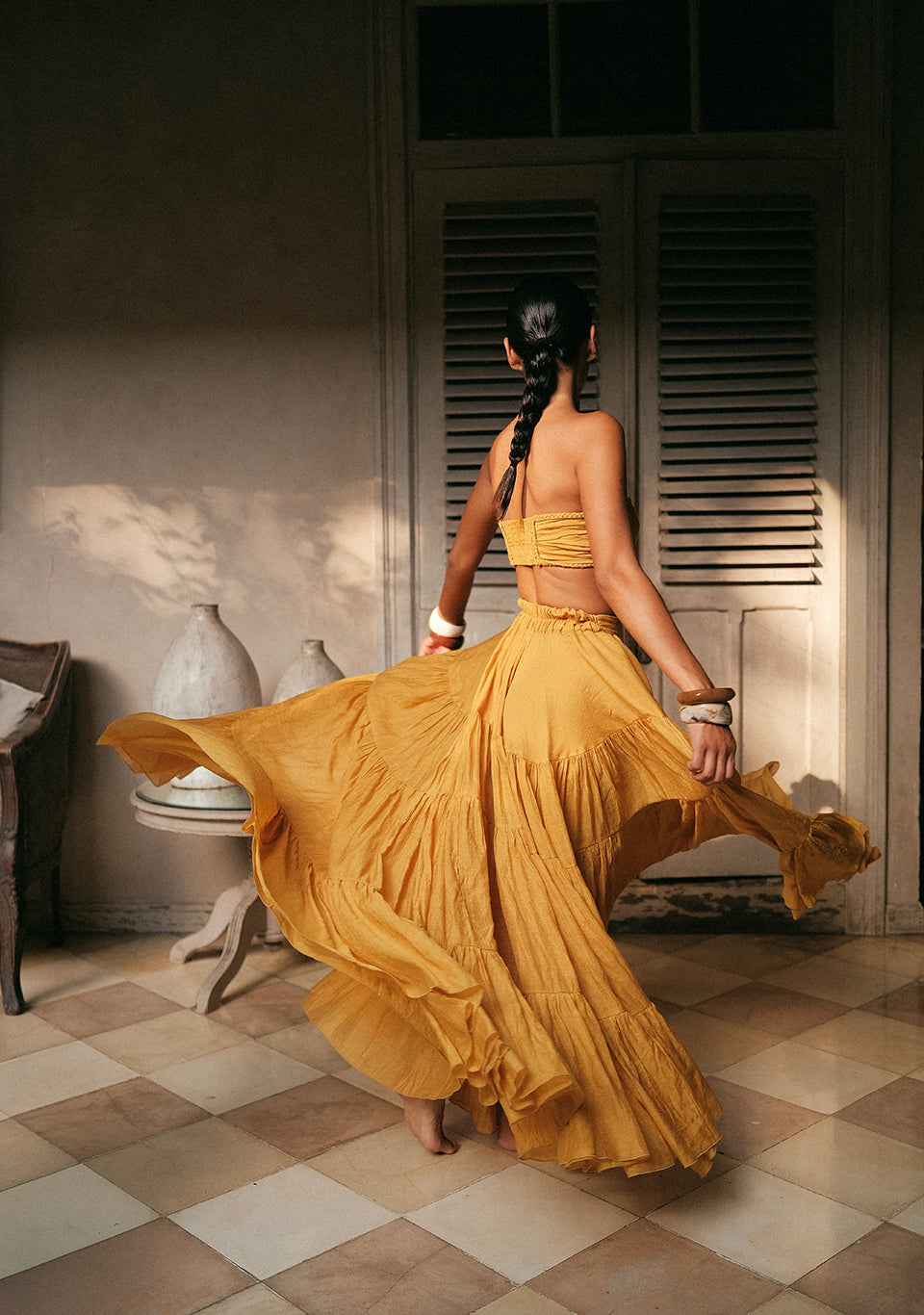 The set features a long, voluminous skirt with multiple cascading ruffles, paired with a stylish top adorned with hand-braided details. The top has a soft elastic back, ensuring a comfortable fit that supports the bust without pressure.