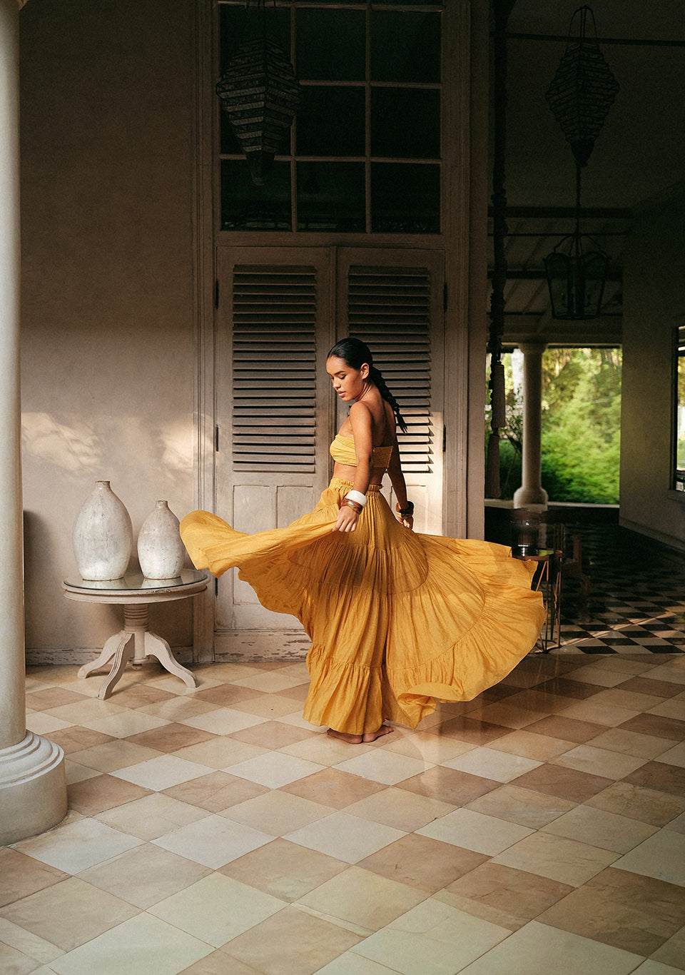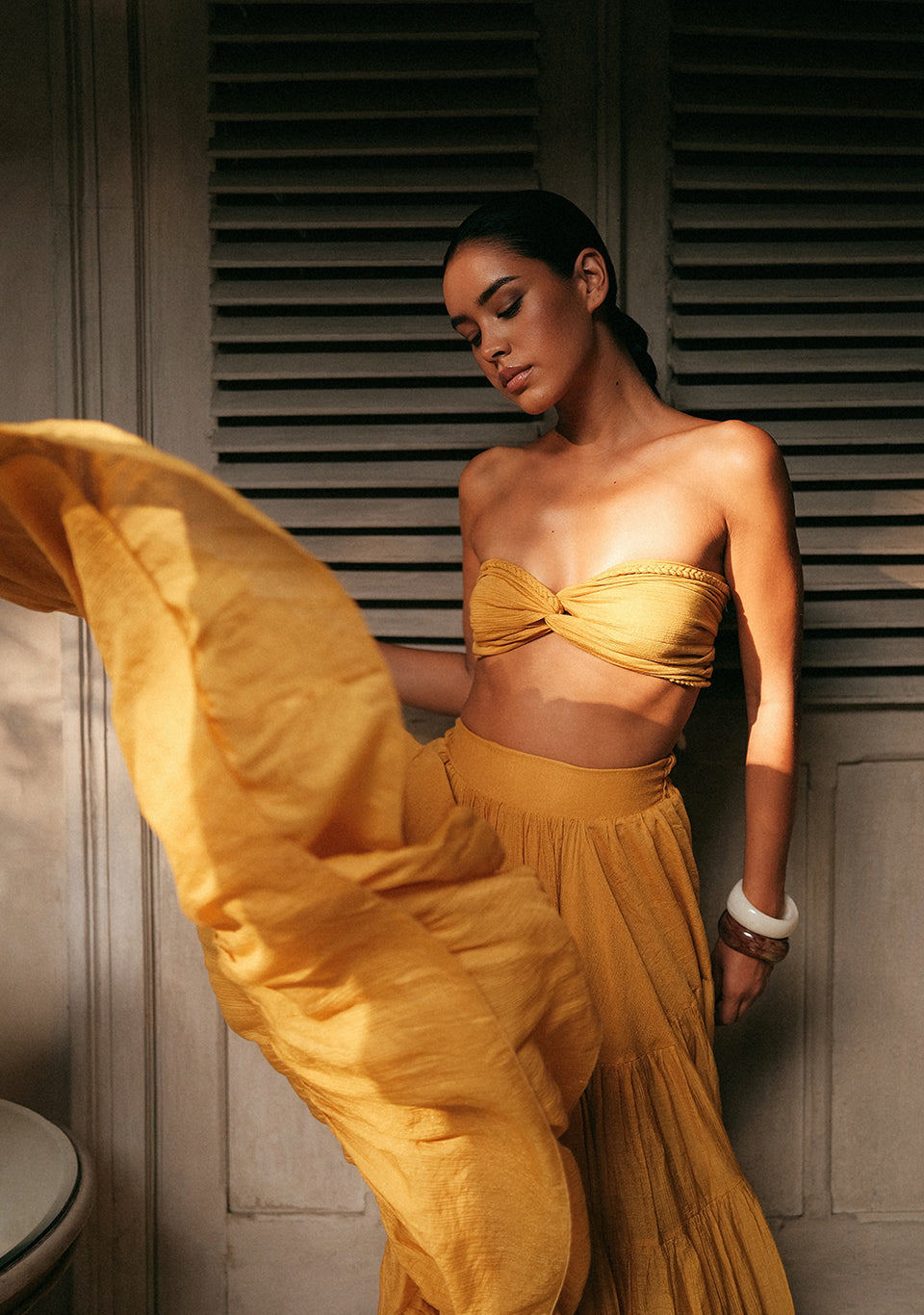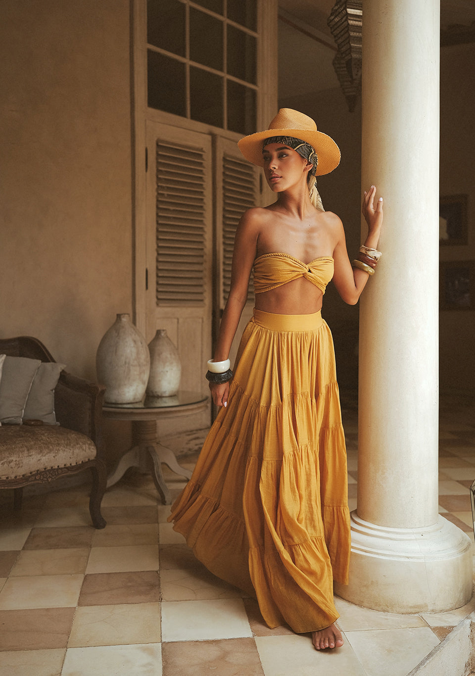 The set features a long, voluminous skirt with multiple cascading ruffles, paired with a stylish top adorned with hand-braided details. The top has a soft elastic back, ensuring a comfortable fit that supports the bust without pressure.