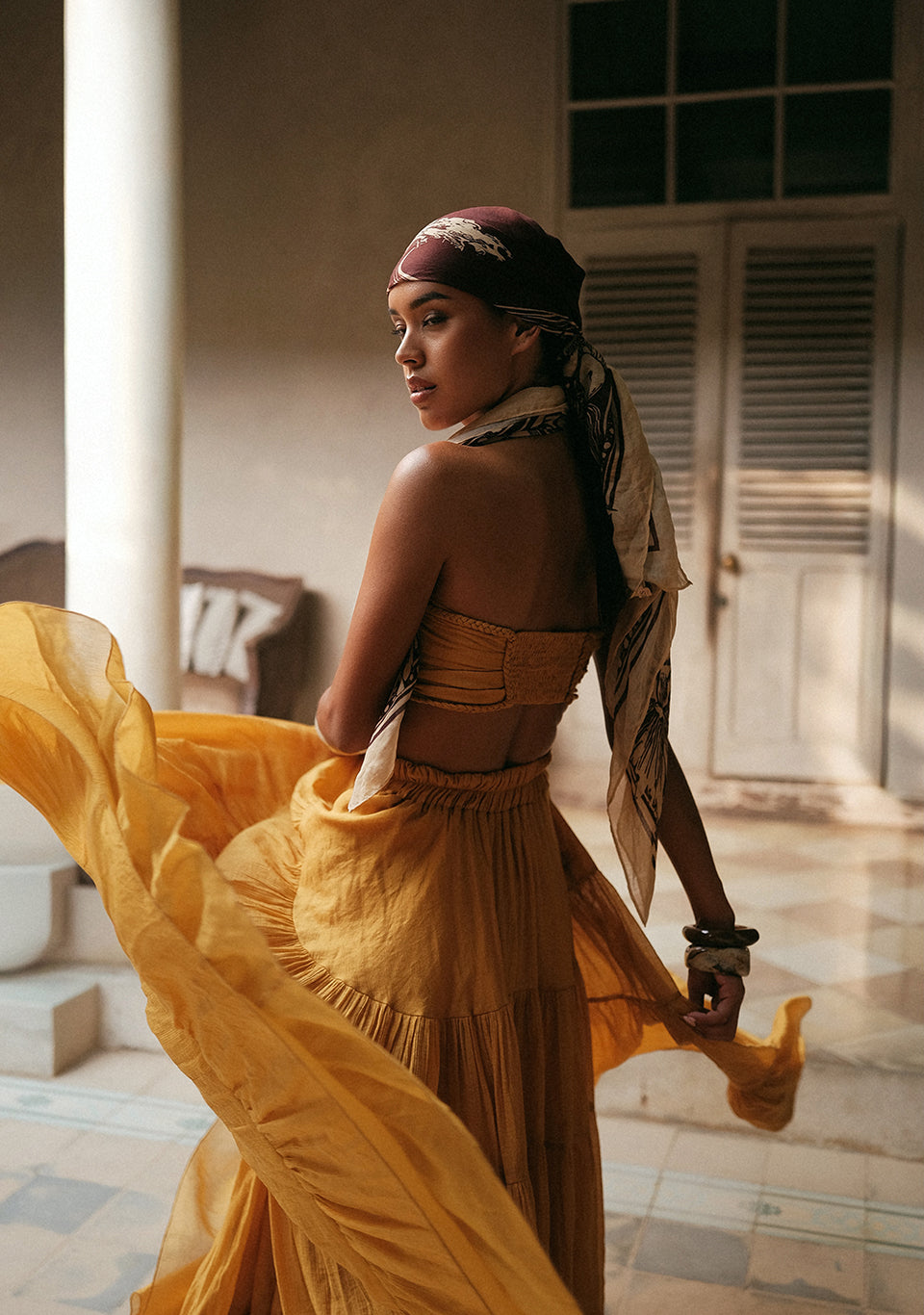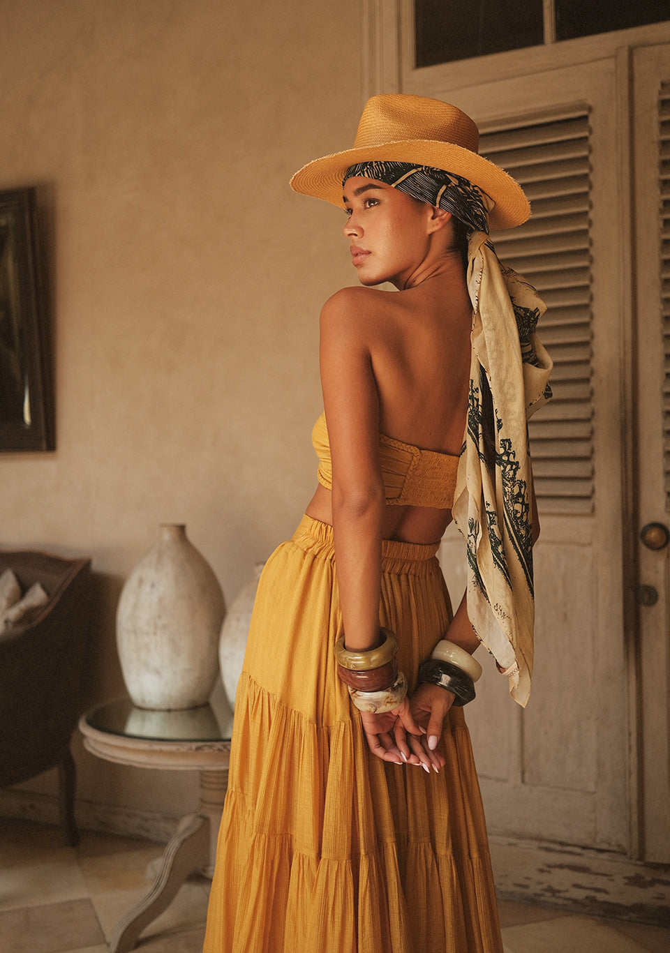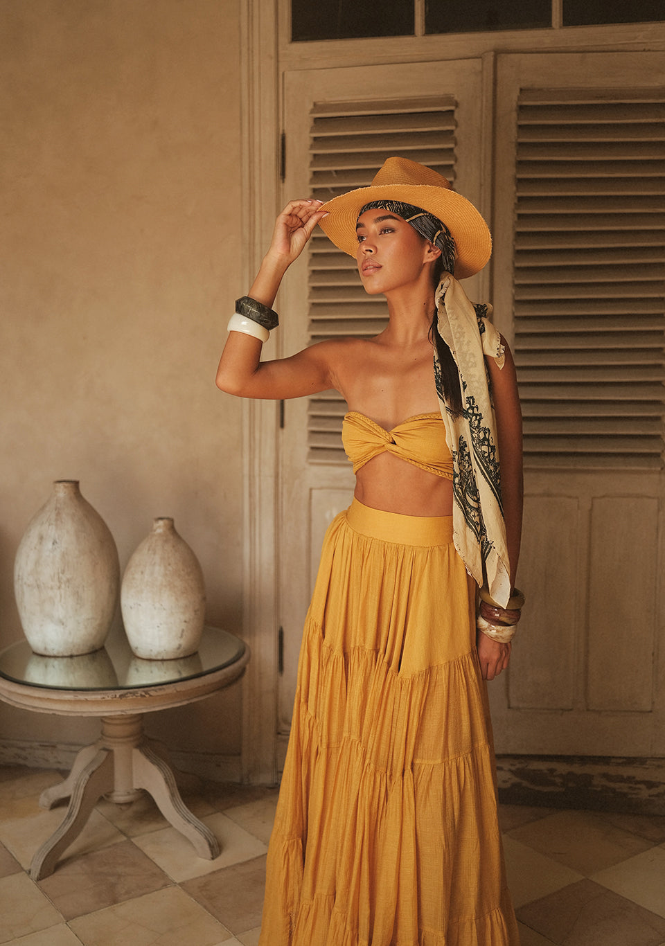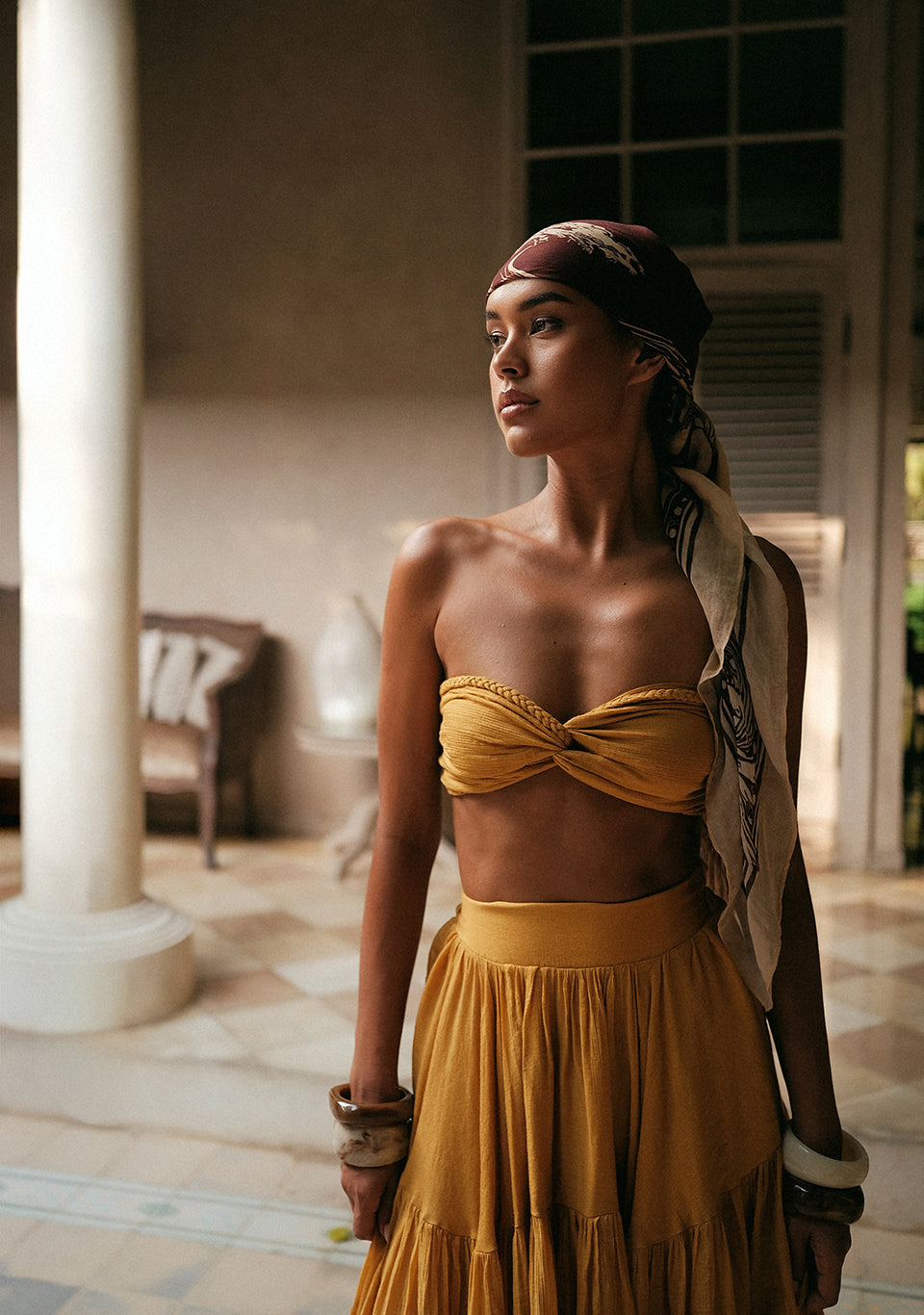 The set features a long, voluminous skirt with multiple cascading ruffles, paired with a stylish top adorned with hand-braided details. The top has a soft elastic back, ensuring a comfortable fit that supports the bust without pressure.
