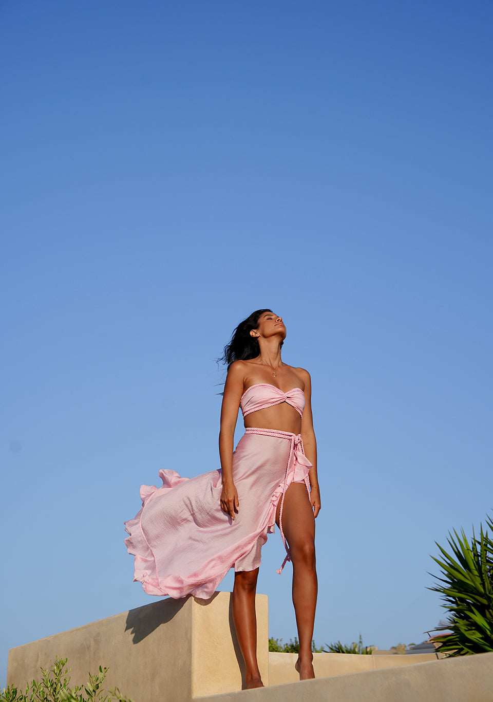 A light and airy set of top and skirt  the perfect choice for hot summer days, seaside holidays, or sunset parties. The look highlights femininity and gives a feeling of freedom and ease.